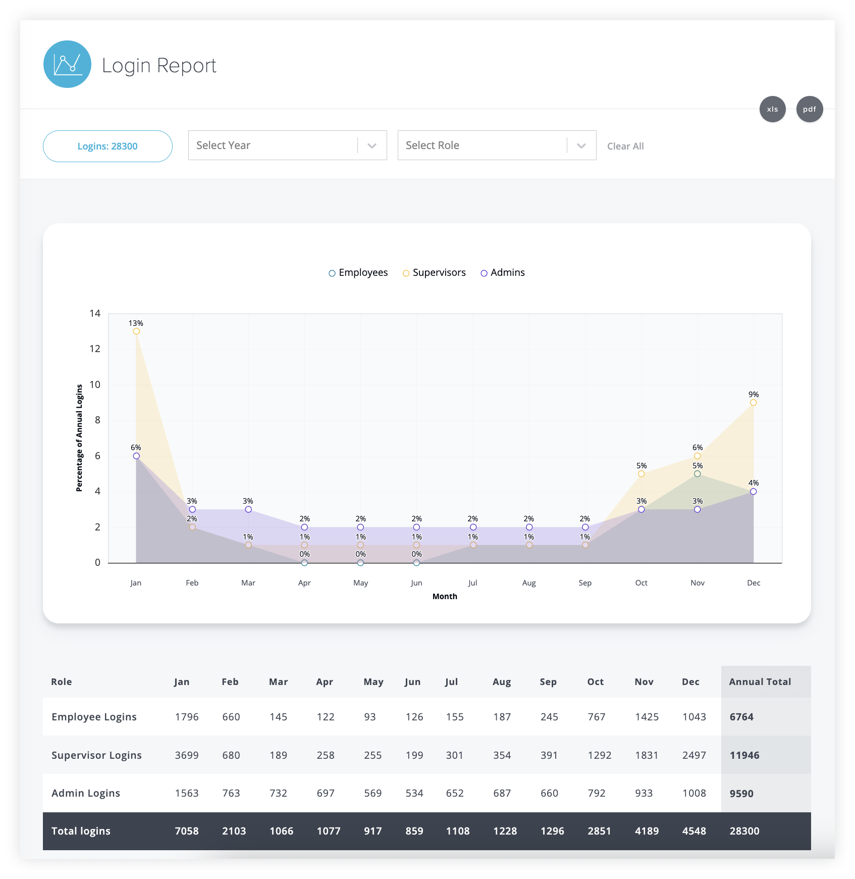 BalancedResults now includes a login report that tracks user activity by month, showing monthly averages across all years and breaking the data down by user type (company admins, supervisors, and employees). The report can be filtered by year and user type, giving you a clear view of engagement patterns throughout the year.