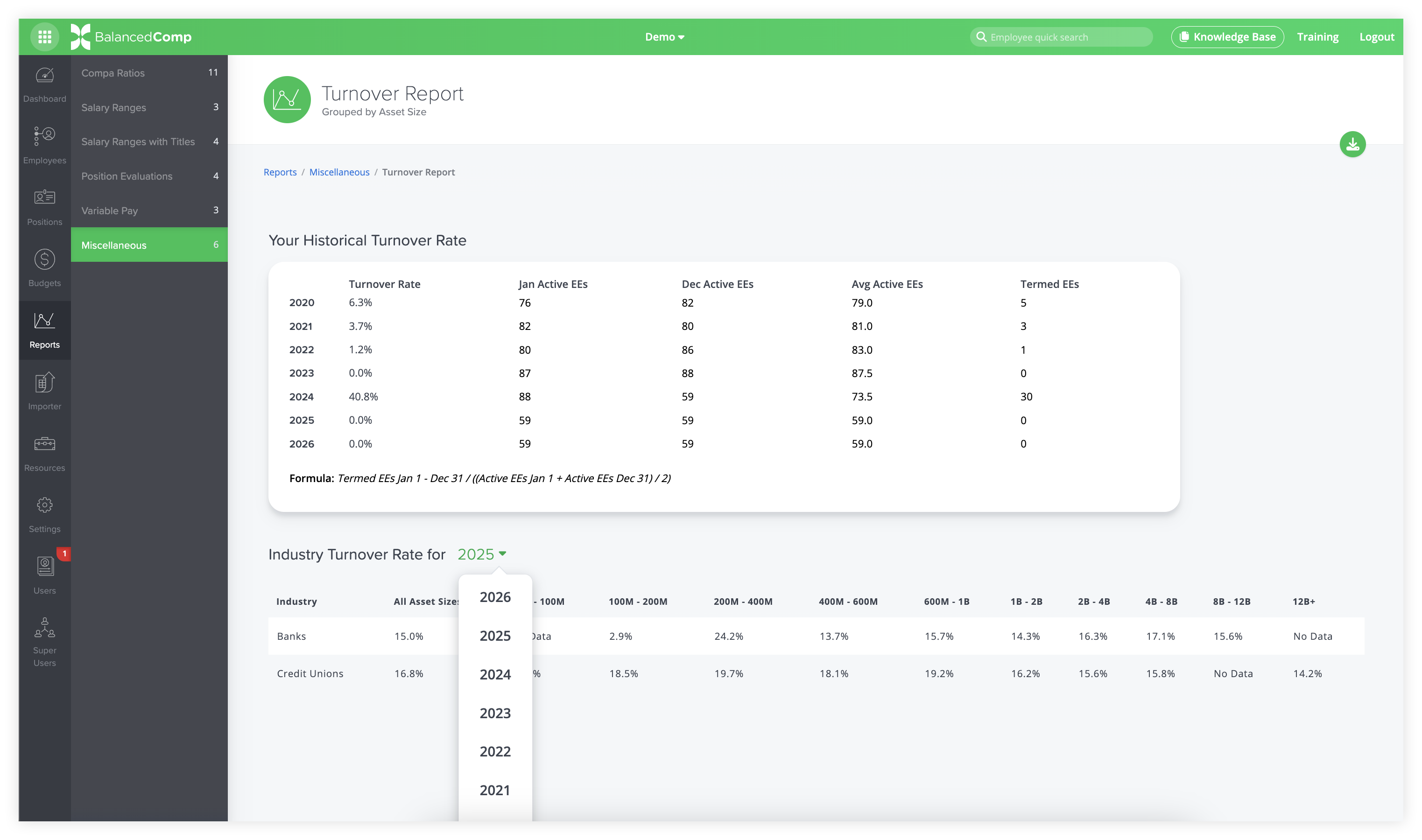 We’ve expanded the Turnover Report in BalancedComp to give you a clearer picture of trends over time. Previously, the report showed turnover data for the most recent complete year. Now, you can see turnover rates for every year since 2020, both for your peer group and all other asset sizes and industries.